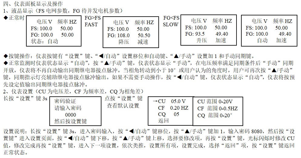 ◆當(dāng)待并聯(lián)發(fā)電機(jī)的電壓和頻率大于電網(wǎng)的電壓和頻率時(shí),液晶顯示狀態(tài)“降壓 減速”,如果小于電網(wǎng)的電壓和頻率時(shí),液晶顯示狀態(tài)“升壓 加速”。