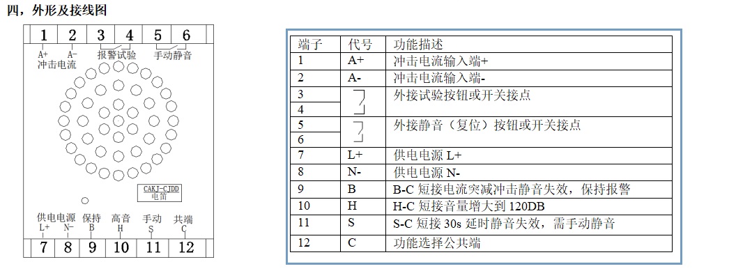 注:電笛基本功能:某個(gè)光字牌報(bào)警時(shí)通過(guò)報(bào)警母線將電流輸入電笛,電笛檢測(cè)到突變的沖擊電流,則發(fā)出報(bào)警聲。若報(bào)警未返回,則延時(shí)30s自動(dòng)靜音。若在30s內(nèi)報(bào)警信號(hào)消失,就形成電流突減狀態(tài),電笛同樣自動(dòng)靜音。若選擇將B-C短接,則電流突減靜音功能失效,瞬時(shí)信號(hào)消失后保持報(bào)警。若同時(shí)將S-C短接,則30s自動(dòng)靜音功能失效,在有信號(hào)報(bào)警時(shí)一直保持鳴響,需按外接手動(dòng)靜音按鈕靜音。若一個(gè)信號(hào)報(bào)警后未返回,且已靜音,其他信號(hào)再次報(bào)警時(shí)將重復(fù)上述報(bào)警過(guò)程,電笛最多能承受2.5A的熱穩(wěn)定電流。電鈴與以上描述相同。