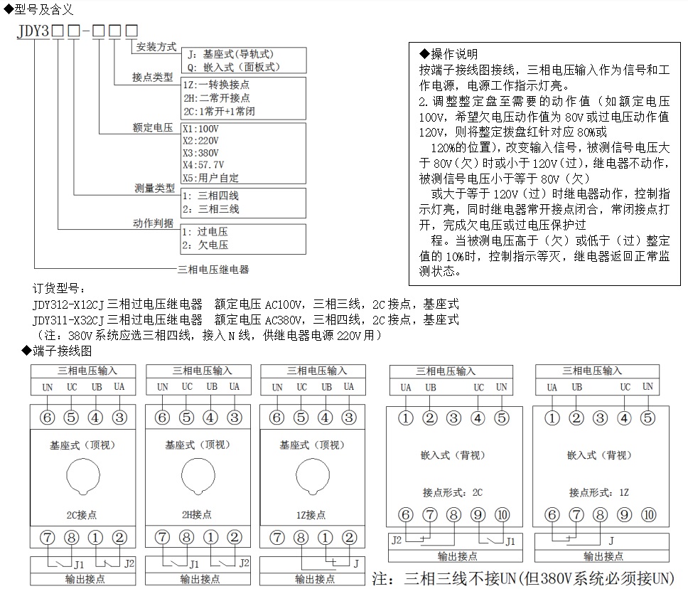 JDY300可調(diào)節(jié)三相電壓繼電器,適用于高壓35kv,10kv或低壓400v線路及用電設(shè)備,作為三相電壓檢測(cè)及控制設(shè)備。